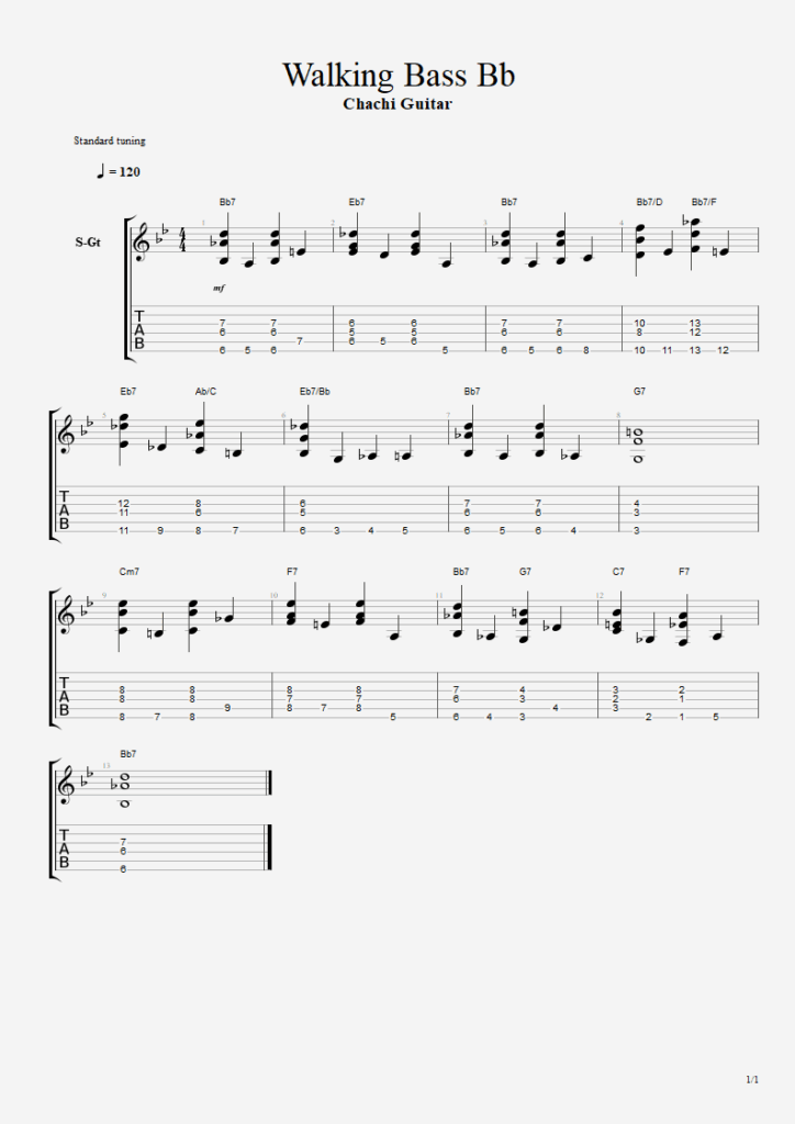 En nuestro caso, lo aplicamos sobre un blues en Bb, intercalando los acordes con notas de bajo que caminan entre ellos.