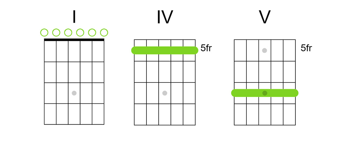 En cualquier afinación abierta, las cuerdas al aire te dan el grado I, el traste 5 el grado IV y el traste 7 el grado V. Con solo este esquema —I, IV y V— ya tienes la base del blues. Y lo mejor: funciona igual en afinación abierta en Re, Sol, Mi o cualquier otra. Es un sistema simple, directo y muy musical.